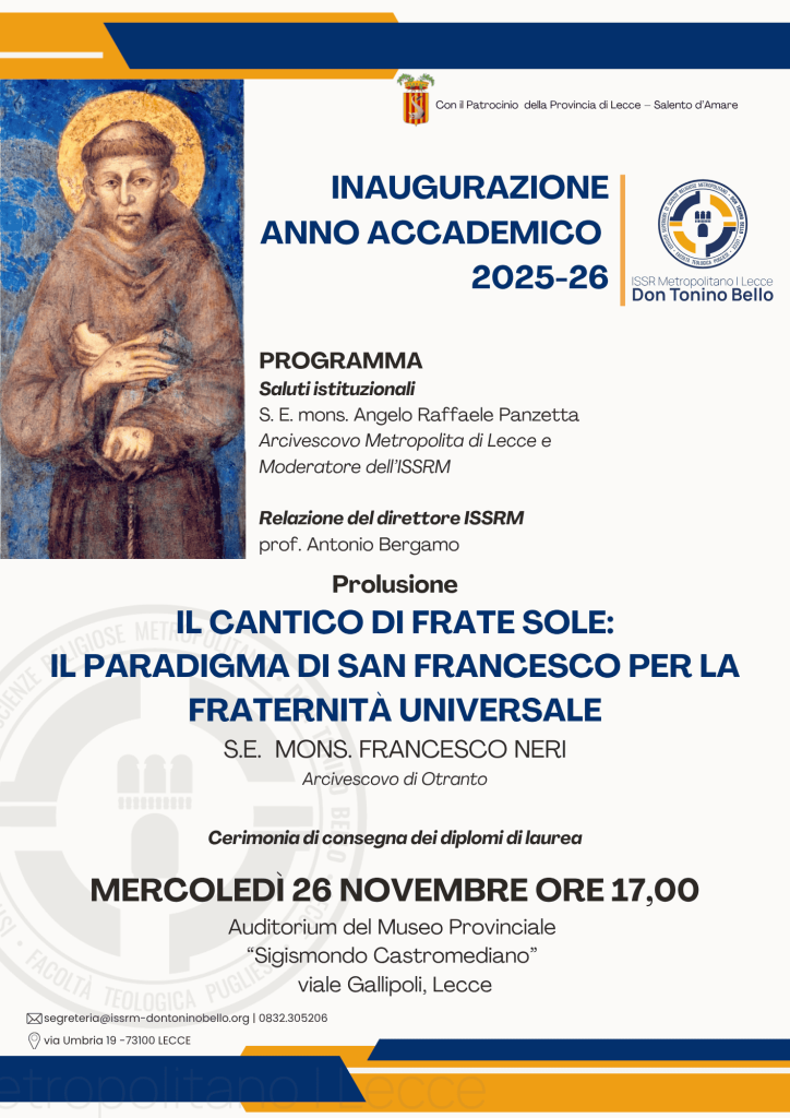L’Istituto Superiore di Scienze Religiose “Don Tonino Bello” è lieto di annunciare l’inaugurazione dell’Anno Accademico 2025-26, un momento solenne che segna l’inizio di un nuovo percorso formativo per studenti, docenti e per l’intera comunità accademica.