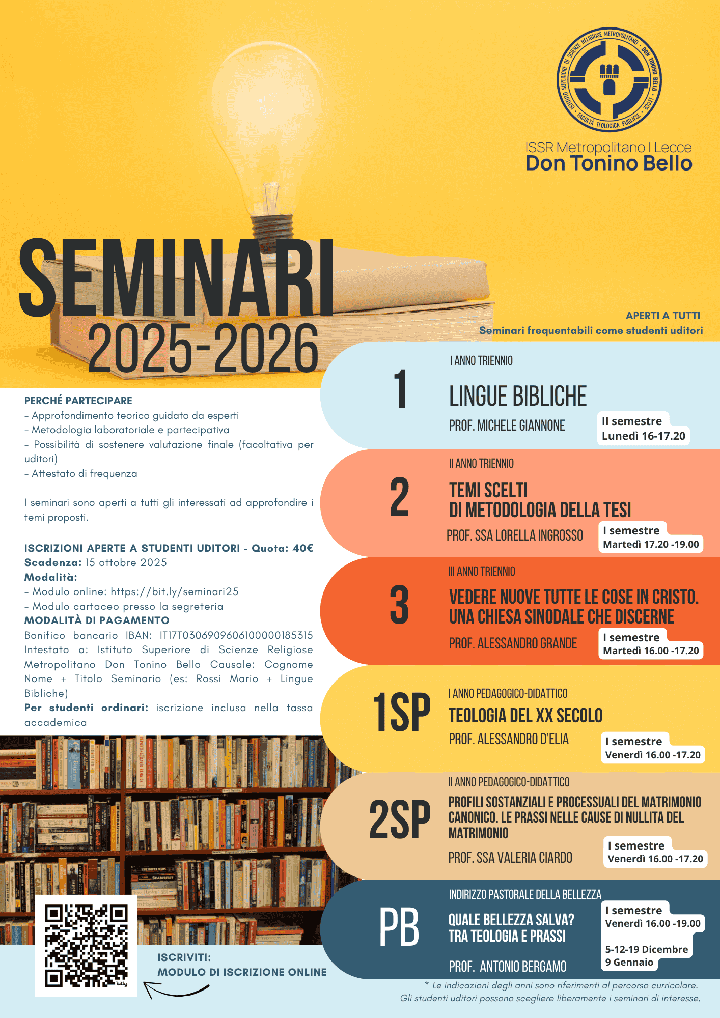 L’Istituto Superiore di Scienze Religiose Don Tonino Bello propone anche quest’anno una serie di seminari di approfondimento, aperti sia agli studenti del percorso curricolare sia a chi desidera partecipare come uditore.